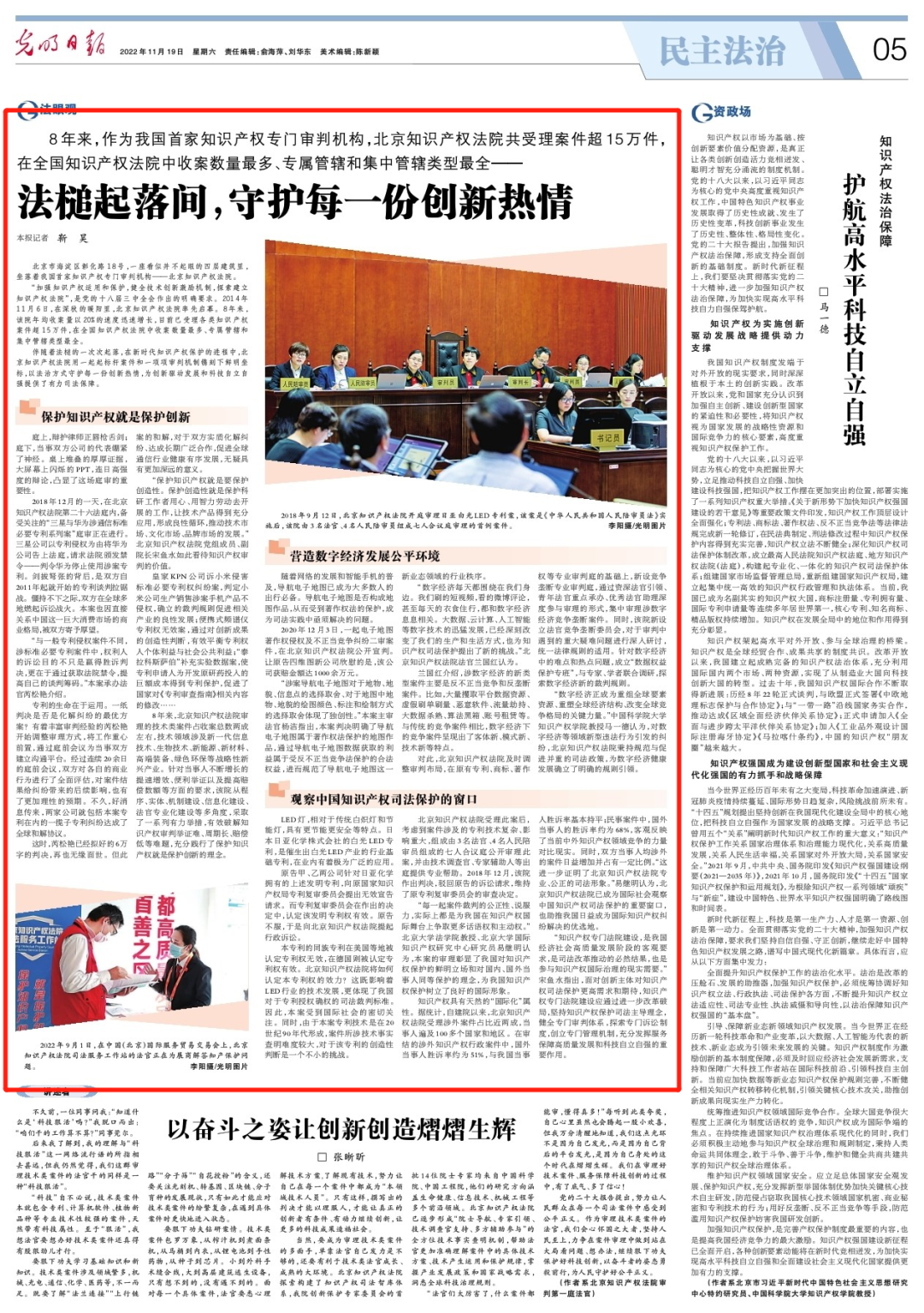 伴随着法槌的一次次起落,在新时代知识产权保护的进程中,北京知识产权法院用一起起标杆案件和一项项审判机制镌刻下鲜明坐标,以法治方式守护每一份创新热情,为创新驱动发展和科技自立自强提供了有力司法保障。