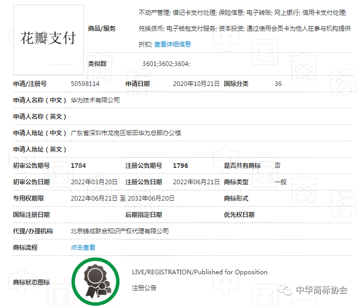 据国家知识产权局商标局官方信息查询,华为已经成功申请“花瓣支付”商标,状态显示已注册,有效期为2022年06月21日至2032年06月20日。