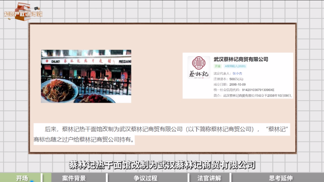 “蔡林记”是一家以热干面为经营特色的老字号面馆,蔡明纬先生一直在蔡林记热干面馆从业直到退休。后来,蔡林记热干面馆改制为武汉蔡林记商贸有限公司,并将“蔡林记”商标一并过户,“蔡林记”商标从此与蔡明纬家族已无实际关联。