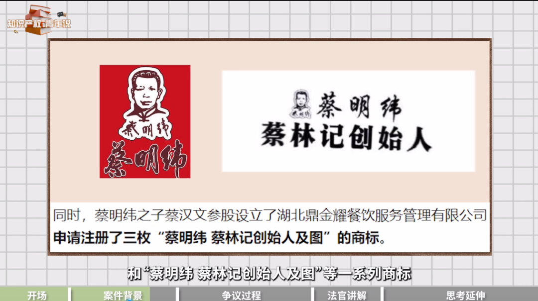 2013年,蔡明纬先生的儿子,蔡汉文先生以配方和技术入股参与设立了湖北鼎金耀餐饮公司。2013年起,鼎金耀公司开始大量使用并申请注册了“蔡明纬老蔡林记及图”“蔡明纬 蔡林记创始人及图”等一系列商标,并用作招牌字号,广泛开设饭馆,同样经营热干面等特色餐饮服务,还在其店内海报、餐具上大量使用了“蔡林记创始人”字样,甚至将门店就开设在“蔡林记”热干面的隔壁。