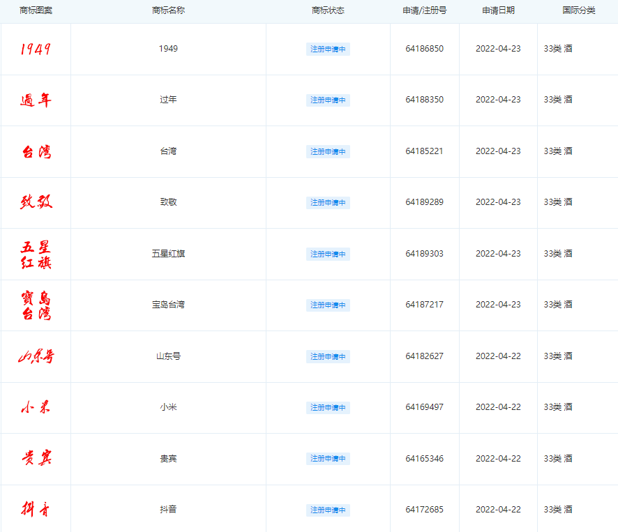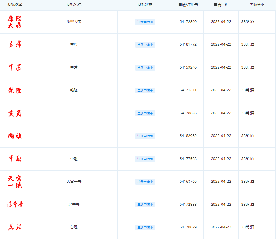 但是商标名称实在不一般,包括“五星红旗”、“台湾”、“宝岛台湾”、“1949”、“过年”、“致敬”、“国旗”、“国宴”、“党员”、“康熙大帝”、“乾隆”、“主席”、“总理”以及“天宫一号”、“辽宁号”、“山东号”等。