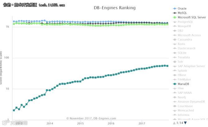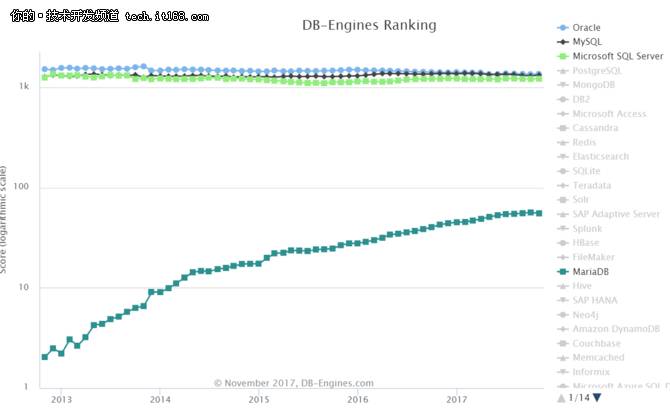 2016年5月,MySQL与Oracle之间的差距不断缩小,并在2017年6月达到历史最接近点,Oracle综合得分为1351.762,而MySQL综合得分为1345.307,双方相差仅有短短的6.5分。MariaDB是MySQL的一个分支,如果MariaDB+MySQL组合起来对抗Oracle,其实Oracle的霸主地位早已不保。2016年11月, MySQL得分为1373,MariaDB得分为42,双方分数相加已超过Oracle 1413的得分。