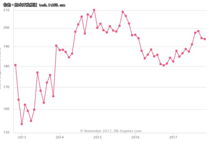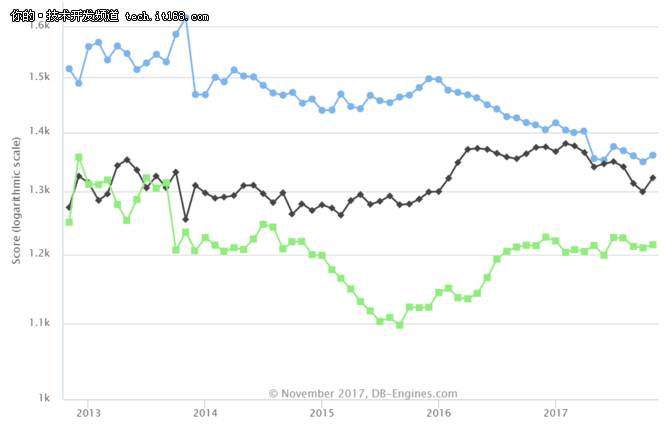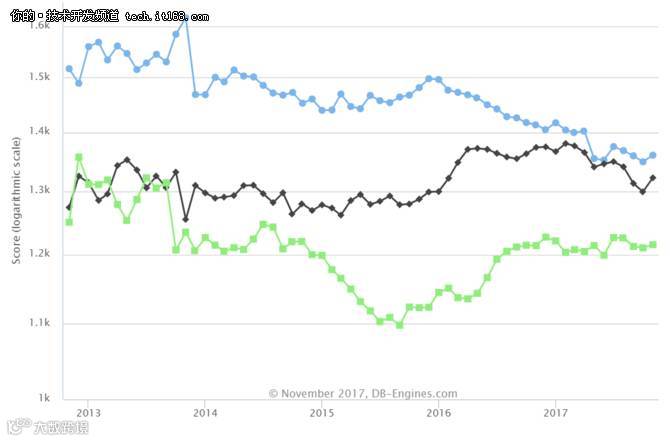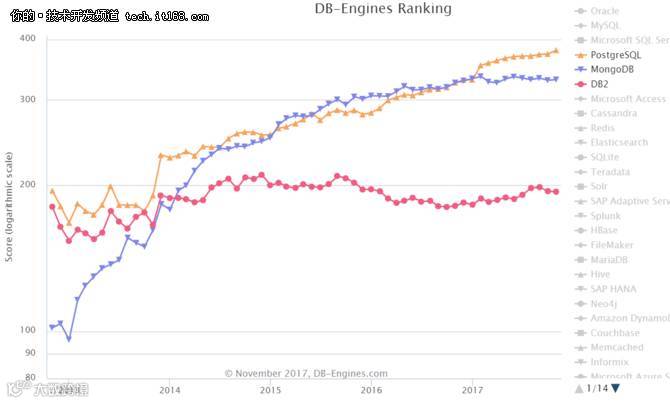 MongoDB和PostgreSQL作为新数据库的代表近几年的发展可谓是突飞猛进,从上图中我们可以看到,他们两已经远远的将DB2甩在了身后。2017年,关于MongoDB和PostgreSQL的声音也是不少,如MongoDB IPO,中国开源软件推进联盟PostgreSQL分会成立等等。