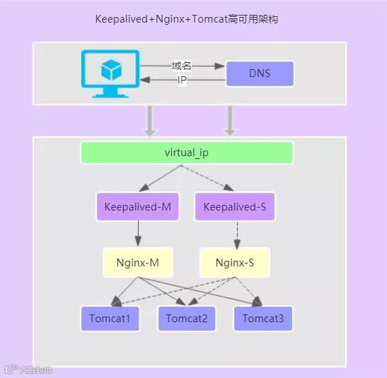 (1)用户通过域名请求到DNS,由DNS解析域名后返回对应的IP地址,该IP及为Keepalived映射服务器的虚拟IP