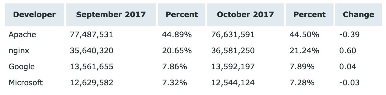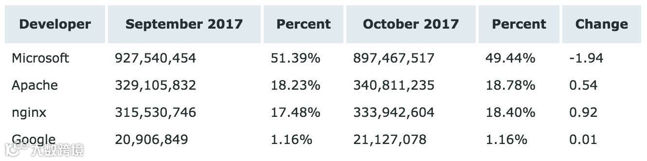 Netcraft 发布了2017年10月 Web 服务器调查报告,排名前三的依然是 Microsoft、Apache 和 nginx 。