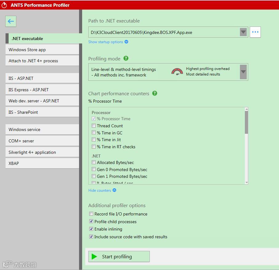 该工具比较直观,可以同时监控代码和SQL执行情况。第一步,New Profiler Session,第二步进行设置,如下图。根据自己的应用程序类别,选择相应的跟踪方式。