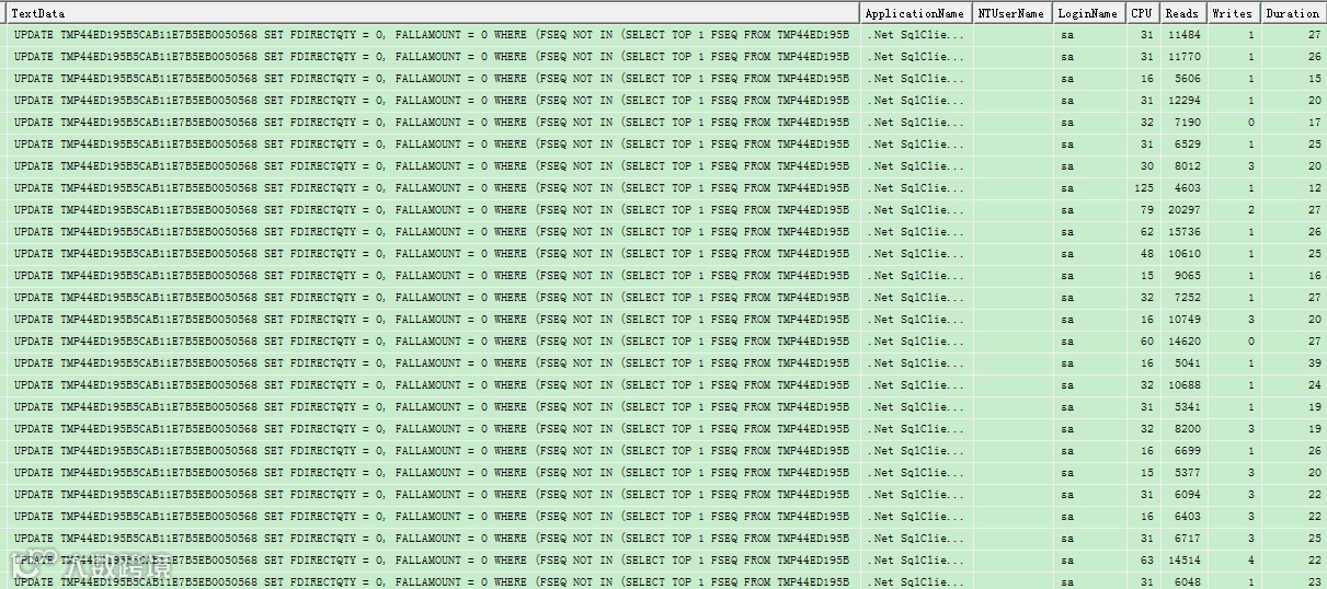由于前几天刚学会用RedGate的分析工具,拿到这个问题,本地尝试重现后,就直接想使用工具分析。然而,这工具在使用webdev模式起站点时,总是报错,而当时时一根筋,老是想解决这个工具的报错问题。结果,白白搞了半天也没搞定。最后不得已放弃工具,转而选择使用sql server profiler去监控sql语句耗时。一跟踪不要紧,问题就直接暴露了,整个全屏的重复sql语句,如下图。