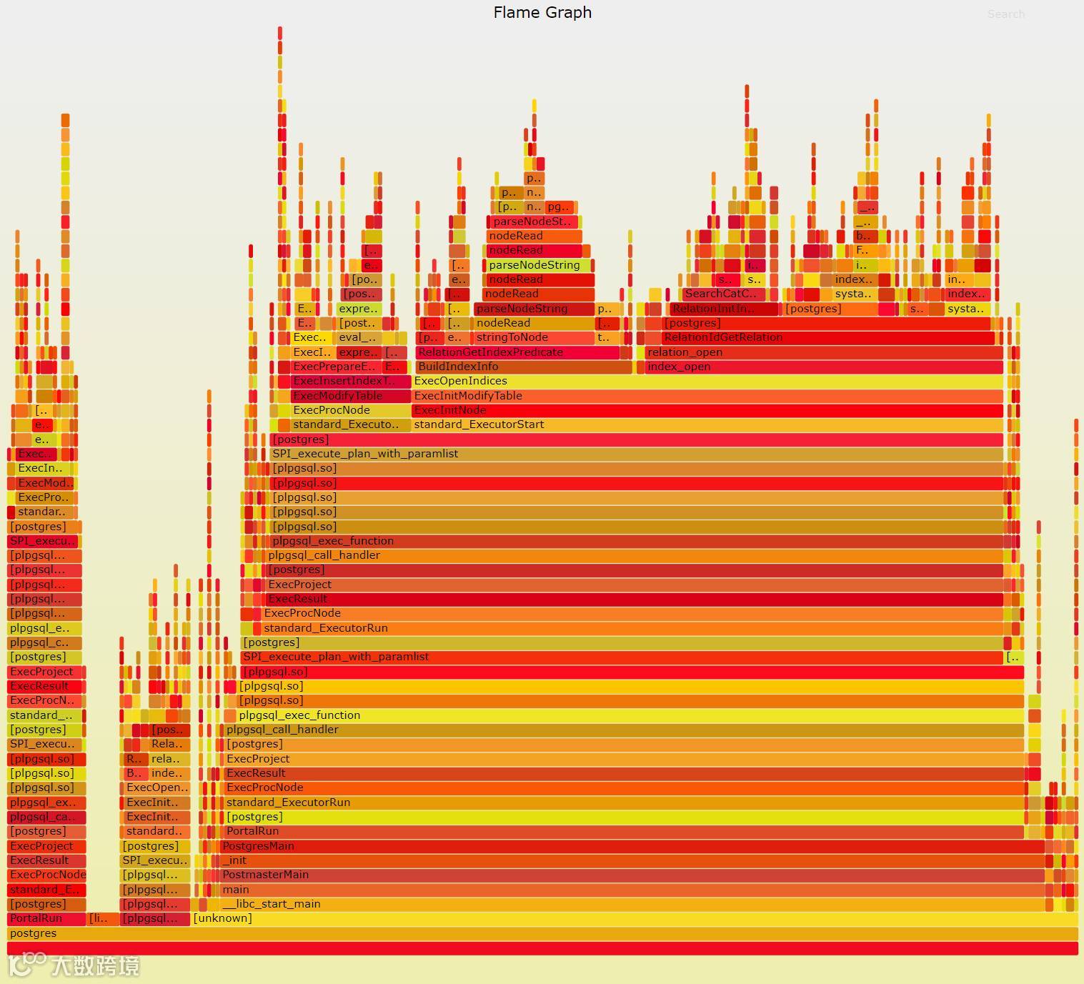 从火焰图中可以清楚地看到,大约 55% 的 CPU 时间花在了 ExecOpenIndices 上(图中行右侧区域的大黄色条)。视线上移一点,可以看到大部分的时间被两个不同的功能所消耗,它们是 BuildIndexInfo 和 index_open。BuildIndexInfo 调用了 RelationGetIndexPredicate,而后者花费了 ~20% 的总 CPU 时间。这样来看,大部分时间都花在了 RelationGetIndexPredicate 上。