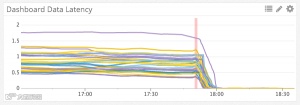 批量插入的初始基准显示 CPU 占用率得到了 10x 的缩减。得知了这一结果,我们开始在生产中测试批量插入。最终,通过对平均大小在 ~50 的事件进行批量插入,我们的吞吐量获得了 10x 的提高。这是对不同 Kafka 部分的吞吐量传输延迟时间,进行批处理前后的对比:左边的单位是延迟时间 (latency time)。我们能够在几分钟内清理完一个小时的积压 (backlog)。