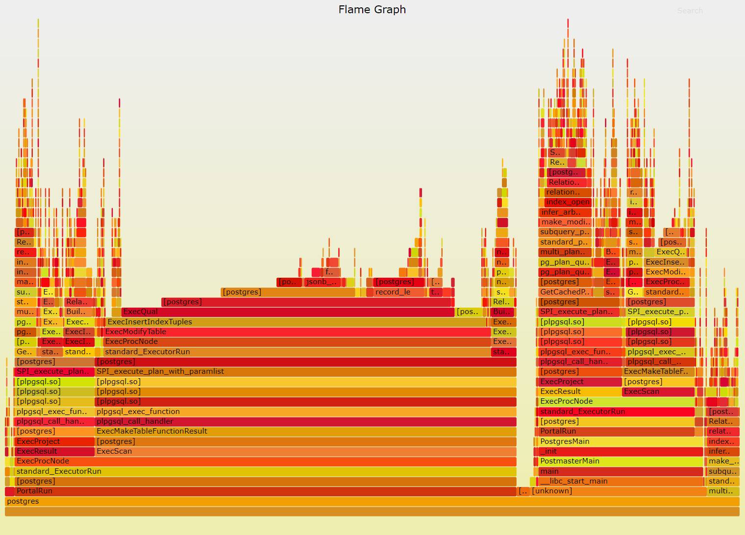 我最初创建的火焰图之一是 Postgres 的后端进程。因为我们使用了连接池,一个简单的后端进程要服务多项请求。由于我们运行的最多的请求是 INSERTs,Postgres 后端进程的火焰图能够让我们清楚地看到,事件插入数据库时的 CPU 占用情况。在 pid 中对来自 pg_stat_activity 的 Postgres 进程运行以上命令后,我获得了下面这张火焰图: