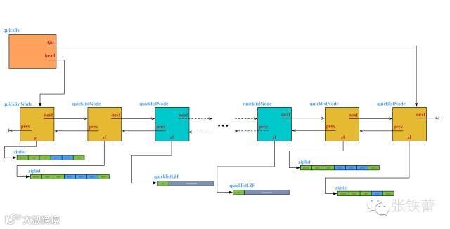 两端各有2个橙黄色的节点,是没有被压缩的。它们的数据指针zl指向真正的ziplist。中间的其它节点是被压缩过的,它们的数据指针zl指向被压缩后的ziplist结构,即一个quicklistLZF结构。