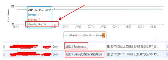 第二类:由于只读节点上会有用户的查询在上面运行,所以如果只读节点上有一个执行时间非常长的的查询正在执行,那么这个查询会堵塞来自主库的DDL,直到查询结束为止,进而导致了只读节点的数据延迟。在只读节点上可以通过执行show processlist命令查看连接的状态处于: Waiting for table metadata lock