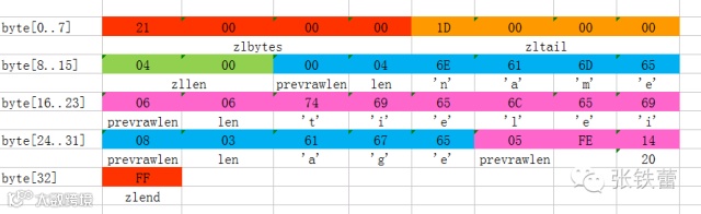 这个ziplist一共包含33个字节。字节编号从byte[0]到byte[32]。图中每个字节的值使用16进制表示。