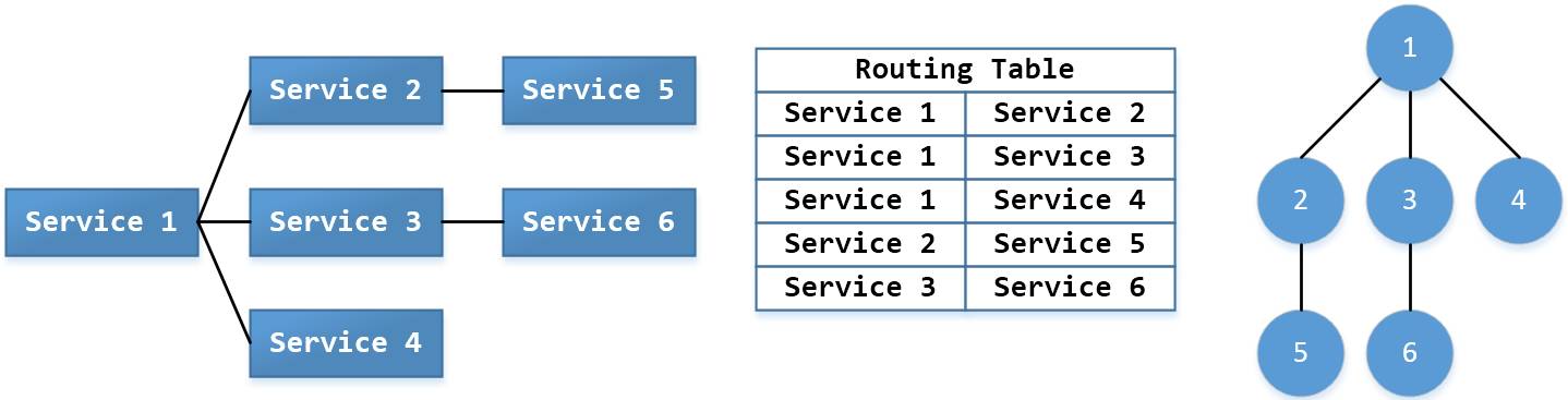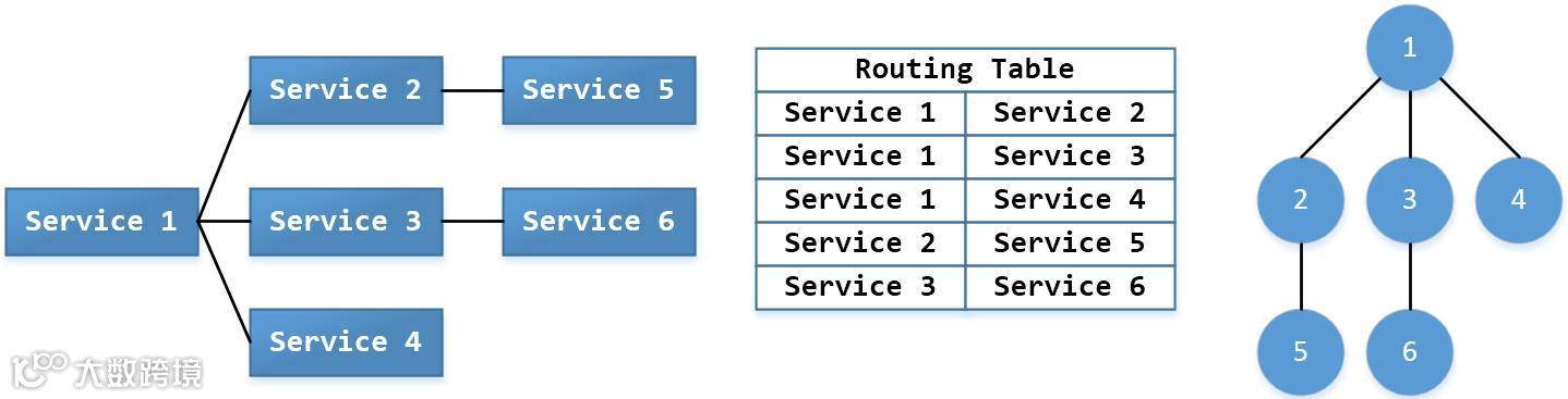 每个服务实例在主动成功连接对端服务后,通过 SERVICE MANAGER 将连接以边的形式写入到 SERVICE DISCOVERY 中,这样就会以 邻接边 的形式生成一张完整的图结构,也就是routing table。比如: Service 1 和 Service 2,Service 3,Service 4 均有连接,那么将边(1,2),(1,3),(1,4) 记录下来。SERVICE DISCOVERY 关于路由邻接链表的记录可以使用公共的key,比如: /AppID/Area/Platform/routing_table 。然后所有的服务实例都可以更新、访问该路径以便获得一致的路由表。基础功能有两个: