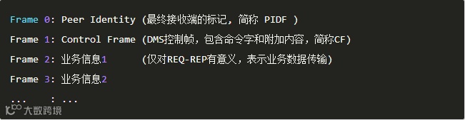 DMS的协议实现集群管理,消息转发等基本功能。ZeroMQ的消息可以由 Frame 组成,一个Frame可以为空也可以是一段字节流,一个完整的消息可以包含多个Frame,称为Multipart Message。基于这种特点,在DMS定义协议,可以将内容拆分为不同的基本单元,每个单元用一个Frame描述,通过单元组合表示不同的含义。这与传统方式:一条协议就是一个结构体,不同单元组合需要定义为一个结构体的方式相比更加灵活。