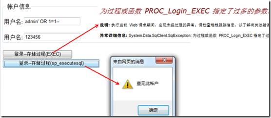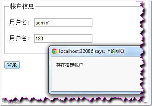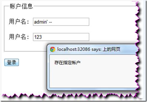 因为UserName值中输入了“–”注释符,后面语句被省略而登录成功。(常常的手法:前面加上‘; ‘ (分号,用于结束前一条语句),后边加上‘–‘ (用于注释后边的语句))