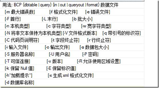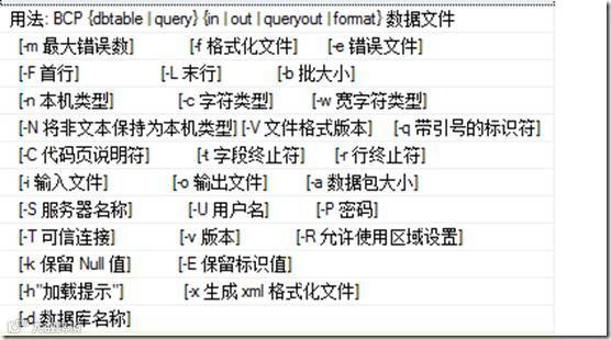 在sql查询器中通过语句:Exec master..xp_cmdshell N’BCP’即可查看BCP相关参数,如图: