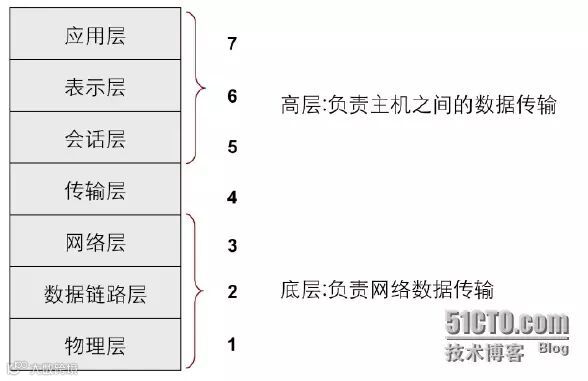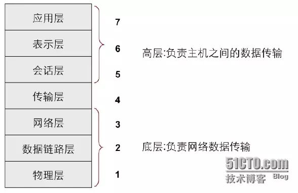 通常OSI参考模型第一层到第三层称为底层(lower layer),又叫介质层(media layer),底层负责数据在网络中的传送,网络互连设备往往位于下三层,以硬件和软件的方式来实现。OSI参考模型的第五层到第七层称为高层(upper layer),又叫住几层(host layer),高层用于保障数据的正确传输,以软件方式来实现。