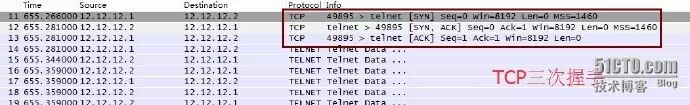 上图为AR1使用TELNET协议远程登录AR2进行的TCP三次握手过程。