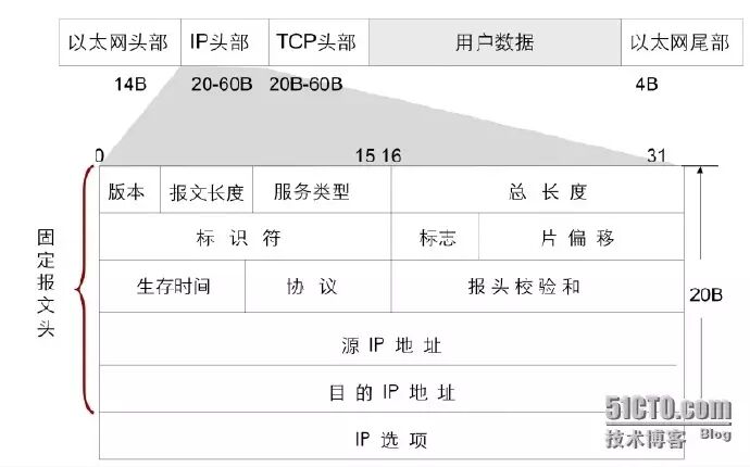 网络层收到传输层的TCP数据段后会再加上网络层IP头部信息。普通的IP头部固定长度为20个字节(不包含IP选项字段)。