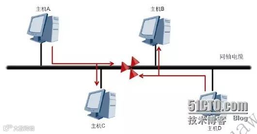 如图是一个10BASE5以太网,每个主机都是用同一根同轴电缆来与其它主机进行通信,因此,这里的同轴电缆又被称为共享介质,相应的网络被称为共享介质网络,或简称为共享式网络。共享式网络中,不同的主机同时发送数据时,就会产生信号冲突的问题,解决这一问题的方法一般是采用载波侦听多路访问/冲突检测技术(carrier sense multiple access/collisiondetection)。