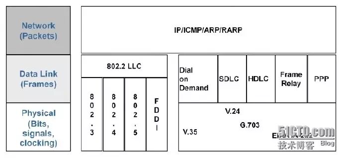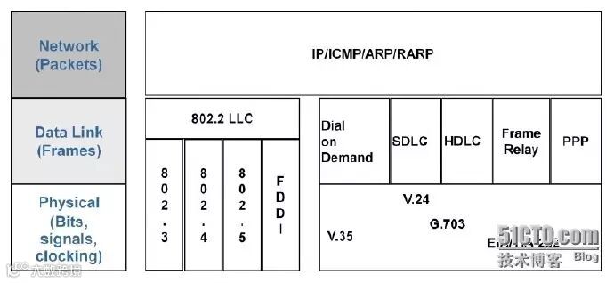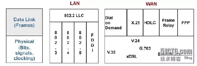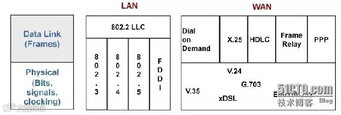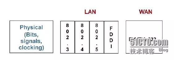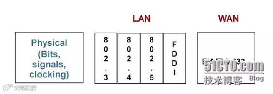 如上图,局域网常用的物理层标准有IEEE指定的以太网标准802.3、令牌总线标准802.4、令牌环网标准802.5以及美国国家标准组织ANSI的X3T9.5委员会制订的光缆标准FDDI(fiber distributed data interface,光纤分布式数据接口)等。广域网常用的物理层标准有电子工业协会和电信工业协会EIA/TIA制定的公共物理层接口标准EIA/TIA-232(即RS-232)、国际电信联盟ITU制定的串行线路接口标准V.24和V.35、以及有关各种数字接口的物理和电气特性的标准G.703等。