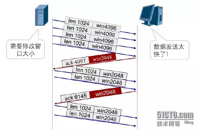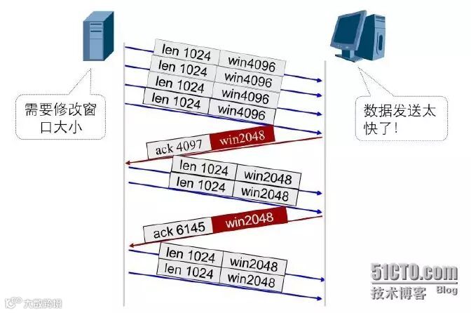 如图中所示以数据单方向发送为例,介绍滑动窗口如何实现流量控制。服务器端向客户端发送4个大小为1024字节的数据段,其中发送端的窗口大小为4096,客户端到以ACK4097响应,窗口大小调整为2048,表明客户端(即接收端)缓冲区只能处理2048个字节的数据段。于是发送端改变其发送速率。发送接收端能够接收的数据段大小2048的数据段。