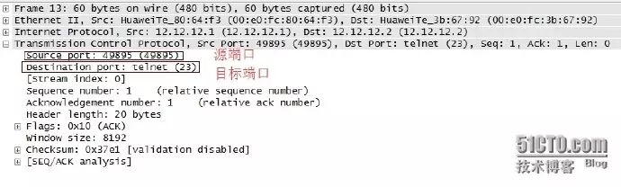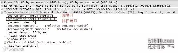源端口号为随机端口号49895,目的端口号为公认TELNET协议端口号23