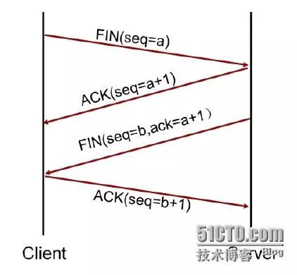 3、服务器端向客户端发送一个FIN终止段(设置序列号为b,确认号为a+1)。