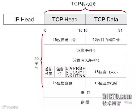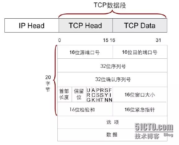 TCP使用IP作为网络层协议,TCP数据段被封装在一个IP数据包内。TCP数据段由TCP Head(头部)和TCP Data(数据)组成。