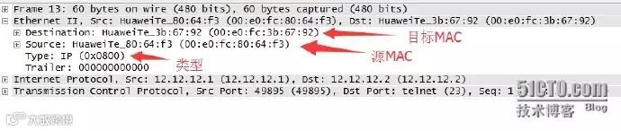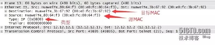 如上图所示,通过例举出的TELNET协议的抓包实例,进一步加深对报文封装的理解。