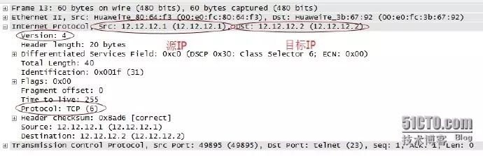 协议字段为0x06,表明数据封装的是一个TCP报文。