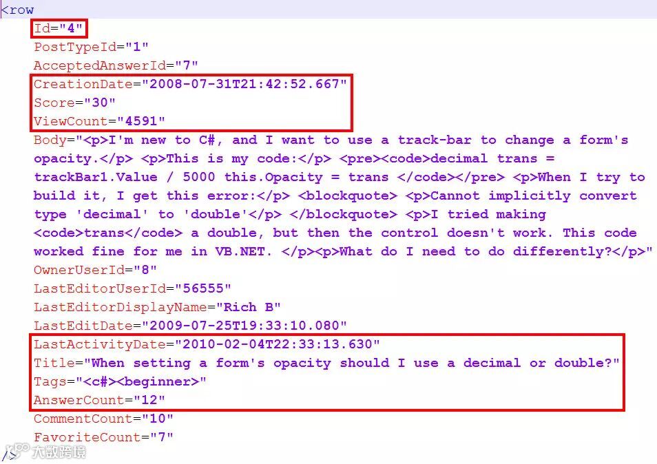 正像我说的那样,如果要建立一套标签引擎,我想应该先看一下它会处理处理哪些数据【译者注:额,原作者之前真的没有说过,他给出的链接里也没有说过,大家看看就好】。为了简化问题,只管第一次发布的内容(不包括编辑历史),我下载了stackoverflow.com-Posts.7z(高能预警,这个文件有5.7GB),这个压缩包中最新数据是到2014年9月份的。简单描述一下这份数据长什么样子的吧,一个典型的问题长得就像下面这个xml文件的样子。对于标签引擎,我们只需要关系红色框框住的部分即可,因为它只需要提供一个索引,所以它只需要关注meta-data,不需要关心问题的具体内容是什么。