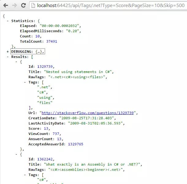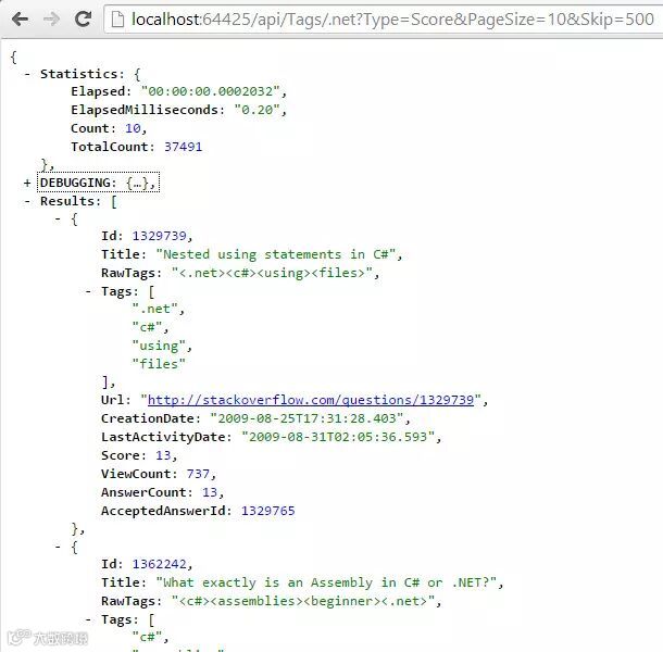 上面的工作搞定后,我就可以提供API,你可以通过浏览器来查询了。注意下图中的时间是在服务器处理的时间,事实上这个数字也是靠谱的,查询单个标签的速度非常非常快。