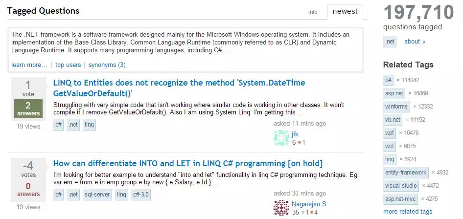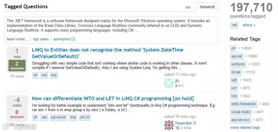 但是只要你上过Stack Overflow,你一定用过这个功能,而且用的时候可能都没意识到它的存在。它的能力主要通过 stackoverflow.com/questions/tagged 这样的 url 体现出来的【译者注:比如要找带java标签的问题,url就是http://stackoverflow.com/questions/tagged/java】,当你找到所有带.NET、C#或者Java标签的问题时,你可以看到下面这样的页面(注意右边栏中,相关标签已经被选中了)。