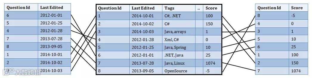 好了,一旦我们建立好了这些排序后的列表,如上图表示的那样(编辑时间从近到远,分数从低到高),我们可以很容易的从这两个数组中获取他们在问题主表Quesitons列表中的数据。举个例子,遍历Score数组(1,2,…,7,8),获取所有的Id,可以得到这样的数组{8,4,3,5,6,1,2,7},数组内容就是他们在主表Questions中的位置。下面的代码就是表述如何怎么查询的,同时考虑到了翻页的情况(pageSize和skip)。