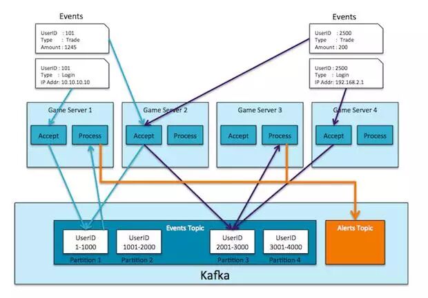 当用户登陆或者发起交易动作后,负责接收的服务器立即发事件给 Kafka。这里我们采用用户 id 作为消息的主键,具体事件作为值。这保证了同一个用户的所有的交易信息和登陆信息被发送到 Kafka 分区。每一个事件处理服务被当作一个 Kafka 消费者来运行,所有的消费者被配置到了同一个消费者群组,这样每一台服务器从一些 Kafka 分区读取数据,一个分区的所有数据被送到同一个事件处理服务器 (可以与接收服务器不同)。当事件处理服务器从 Kafka 读取了用户交易信息,它可以把该信息加入到保存在本地内存中的历史信息列表里面,这样可以保证事件处理服务器在本地内存中调用用户的历史信息并做出预警,而不需要额外的网络或磁盘开销。