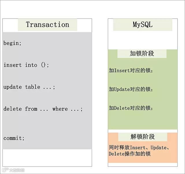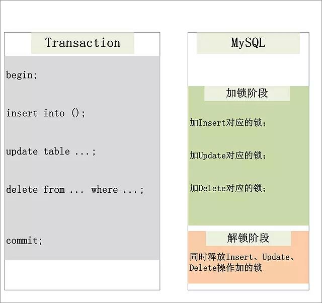 传统RDBMS加锁的一个原则,就是2PL (二阶段锁):Two-Phase Locking。相对而言,2PL比较容易理解,说的是锁操作分为两个阶段:加锁阶段与解锁阶段,并且保证加锁阶段与解锁阶段不相交。下面,仍旧以MySQL为例,来简单看看2PL在MySQL中的实现。