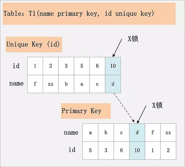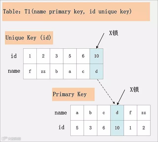 结论:若id列是unique列,其上有unique索引。那么SQL需要加两个X锁,一个对应于id unique索引上的id = 10的记录,另一把锁对应于聚簇索引上的[name=’d’,id=10]的记录。