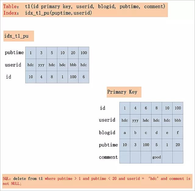 Index key:pubtime > 1 and puptime < 20。此条件,用于确定SQL在idx_t1_pu索引上的查询范围。