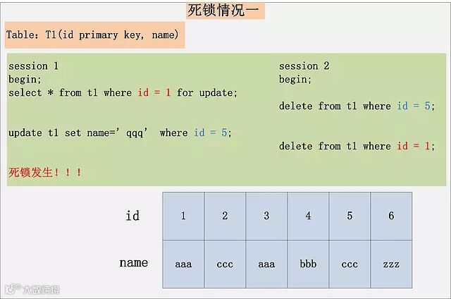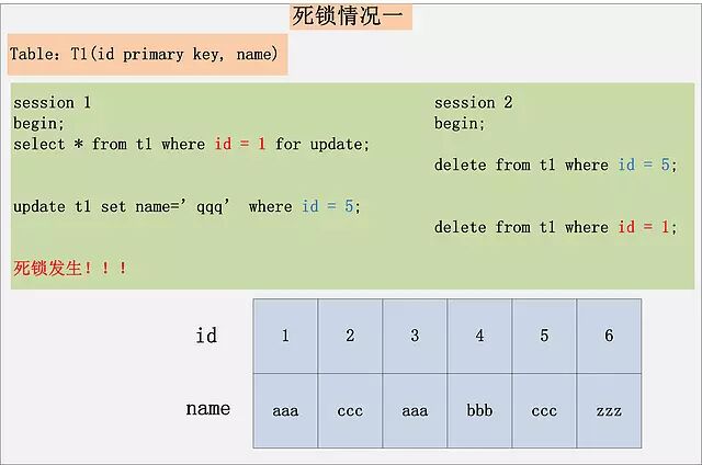 第二个用例,虽然每个Session都只有一条语句,仍旧会产生死锁。要分析这个死锁,首先必须用到本文前面提到的MySQL加锁的规则。针对Session 1,从name索引出发,读到的[hdc, 1],[hdc, 6]均满足条件,不仅会加name索引上的记录X锁,而且会加聚簇索引上的记录X锁,加锁顺序为先[1,hdc,100],后[6,hdc,10]。而Session 2,从pubtime索引出发,[10,6],[100,1]均满足过滤条件,同样也会加聚簇索引上的记录X锁,加锁顺序为[6,hdc,10],后[1,hdc,100]。发现没有,跟Session 1的加锁顺序正好相反,如果两个Session恰好都持有了第一把锁,请求加第二把锁,死锁就发生了。