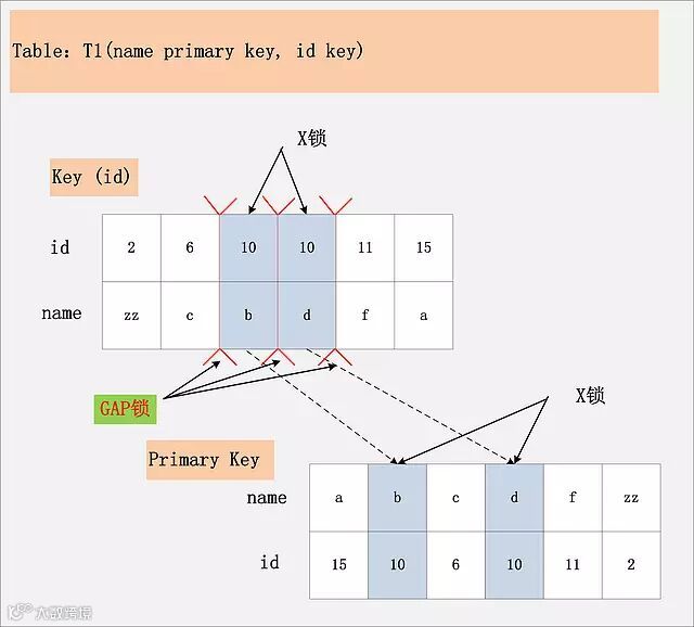 此组合中,id是unique索引,而主键是name列。此时,加锁的情况由于组合一有所不同。由于id是unique索引,因此delete语句会选择走id列的索引进行where条件的过滤,在找到id=10的记录后,首先会将unique索引上的id=10索引记录加上X锁,同时,会根据读取到的name列,回主键索引(聚簇索引),然后将聚簇索引上的name = ‘d’ 对应的主键索引项加X锁。为什么聚簇索引上的记录也要加锁?试想一下,如果并发的一个SQL,是通过主键索引来更新:update t1 set id = 100 where name = ‘d’; 此时,如果delete语句没有将主键索引上的记录加锁,那么并发的update就会感知不到delete语句的存在,违背了同一记录上的更新/删除需要串行执行的约束。