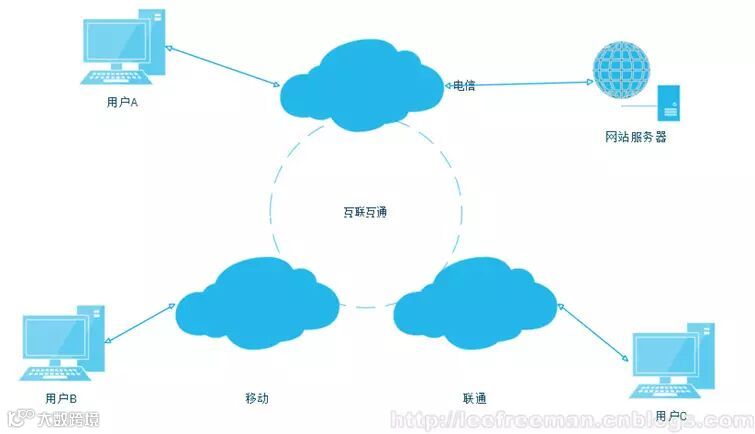 上图表示用户访问网站服务器时网络的大致情况,从图上可以看出假设网站服务器从电信网络接入,而用户A作为电信的宽带用户,则可以通过电信骨干网快速的访问到网站服务器。用户B,用户C作为移动和联通用户需要通过运营商的互联互通经过较长路径才能访问到服务器。