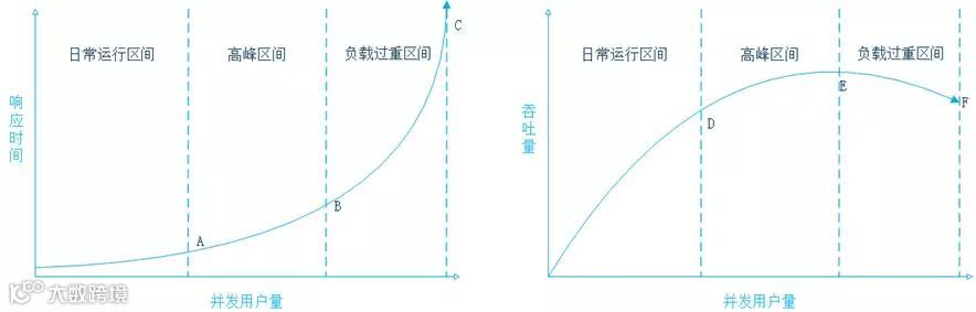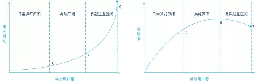 右图表示吞吐量与并发用户量的二维坐标图,可以看出,随着并发用户量的增加,吞吐量逐渐增加;在并发量到达一定量时,由于系统处理能力达到最大,吞吐量增加放缓;当并发量超过系统负载时(E点),系统处理能力开始下降,不能再请求增加的用户请求,吞吐量反而降低。