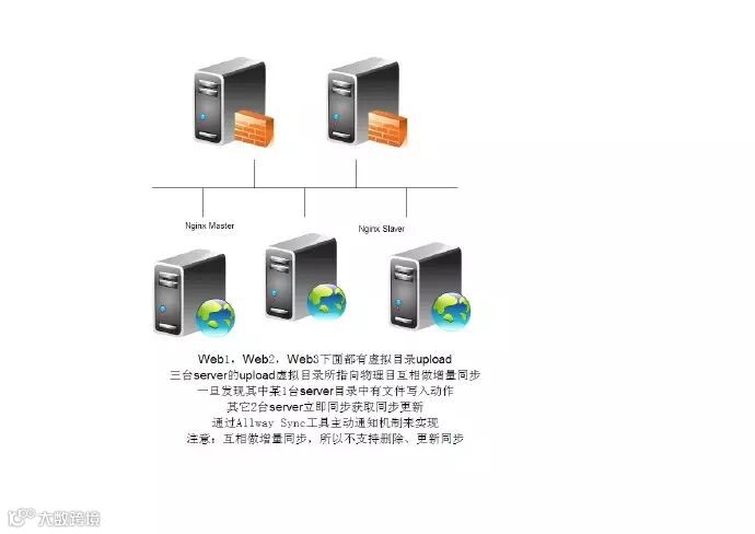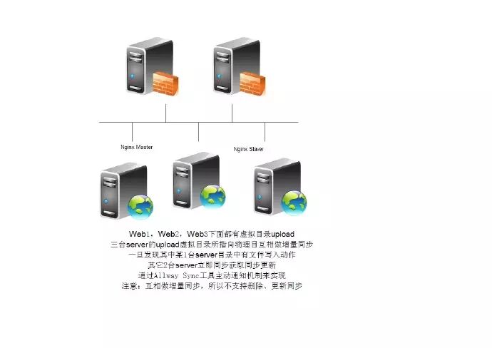 上述架构中只能在这几台Web服务器上互相“增量同步”,这样一来,就不支持文件的“删除、更新”操作的同步了。