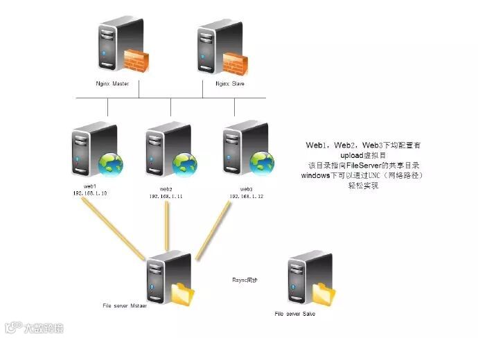 从上图可看出,整个Web服务器架构已经具备“可扩展、高可用”了,主要问题和瓶颈都集中在多台服务器之间的文件同步上。