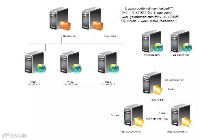 上面提到的几种架构,在上传/下载操作时,都经过了Web服务器(虽然共享存储的这种架构,也可以配置独立域名和站点来提供图片访问,但上传写入仍然得经过Web服务器上的应用程序来处理),这对Web服务器来讲无疑是造成巨大的压力。所以,更建议使用独立的图片服务器和独立的域名,来提供用户图片的上传和访问。