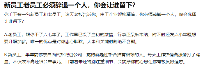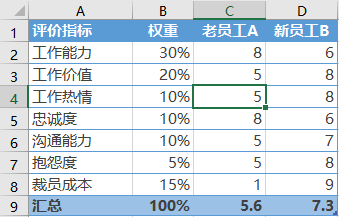 我们先抛开其他的,在这里从数据分析角度来分析一下,可以使用综合评价分析法,将各个考虑因素转化为指标,并根据两个员工在各个方面的表现分别打分,最后再加权计算综合得分,就可以得到结果啦。
