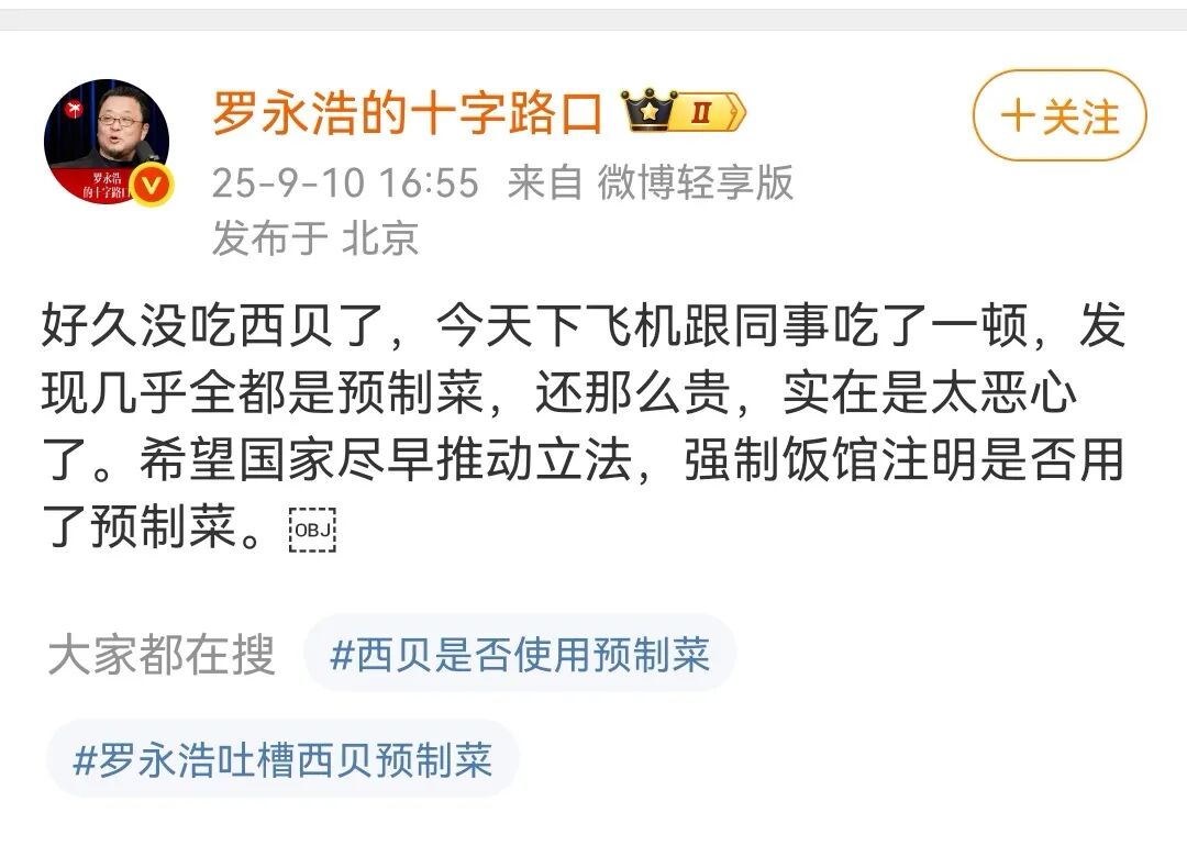 事件起因:一个有知名度有影响力的网络红人罗永浩发布了一条吐槽西贝的微博,重点信息是预制不新鲜和贵