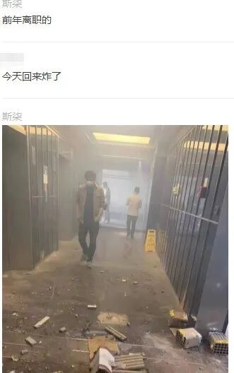 有网友爆料:公司员工离职纠纷,该员工携带大量爆炸物把公司一层楼炸毁了,现场硝烟弥漫,如同战场: